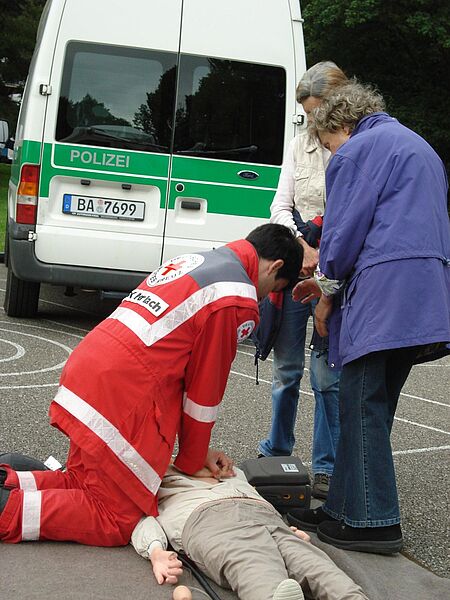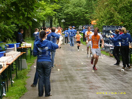 07:45 Uhr, Halbmarathon-Laufstrecke Nähe Aumeister, Regen, 19 Grad: Die Einsatzbereitschaft der RK-Wache wird über Funk an die Zentrale Einsatzleitung übermittelt. Die Wache 8 besteht aus 4 Helfern der BS…