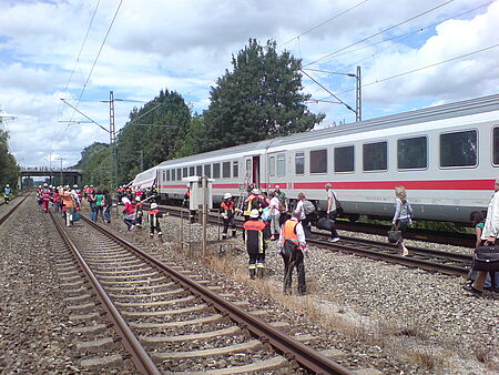 Die Teileinheit Krailling der Schnelleinsatzgruppe (SEG) Starnberg-Nord wurde heute Mittag zu einem Einsatz nach Gröbenzell alarmiert. Der Steuerwagen eines Intercity war aus den Schienen gesprungen. Neun ehrenamtliche Helfer der Bereitschaft Planegg/Krailling rückten unverzüglich zur Einsatzstelle im Industriegebiet von Gröbenzell aus. Sie versorgten mehrere Patienten und übergaben sie an Rettungswagen zum Transport in umliegende Krankenhäuser. Desweiteren mussten viele der knapp 300 Passagiere aus dem Zug betreut und auf dem Weg zu den Ersatzbussen begleitet werden.