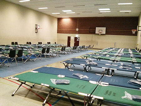 Die Schnelleinsatzgruppe Betreuung des Münchner Roten Kreuzes hat gestern tagsüber im Auftrag der Landeshauptstadt München in einer Schule nahe des Hauptbahnhofs eine Notunterkunft eingerichtet. Zusammen mit Helfern der Malteser und der Freiwilligen Feuerwehr München bauten die ehrenamtlichen Rotkreuzler Feldbetten auf und bereiteten alles für den Betrieb vor. Abends kamen Helfer des Arbeiter-Samariter-Bundes dazu. Gegen 22 Uhr war der Einsatz beendet.