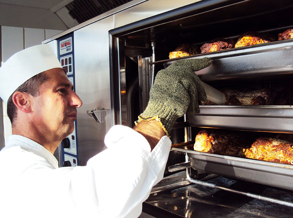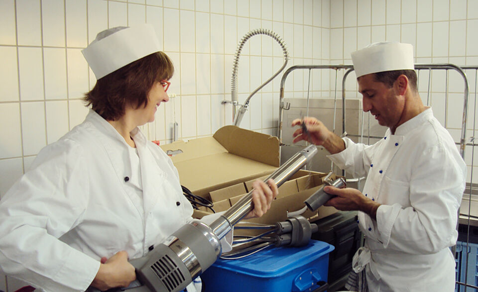 Betreuungsdienstes des Münchner Roten Kreuzes in der Großküche im Lehel. Der Auftrag: 600 Portionen Schweinebraten für das 100jährige Jubiläum des Roten Kreuzes in Planegg und Krailling zubereiten und anschließend am Festplatz ausgeben.