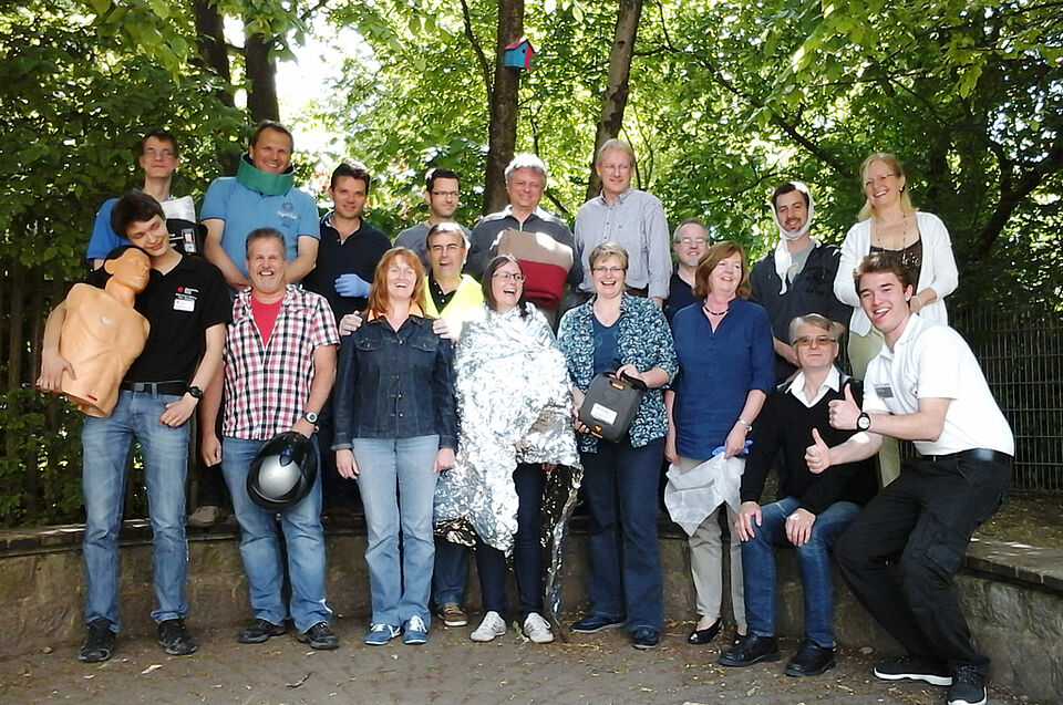 Zum Schluss gab es eine kleine Überraschung für die Teilnehmer: die Rotkreuzler ließen sie ein realistisches Fallbeispiel üben. Dazu hatten sie einen Verkehrsunfall zwischen einem Auto und einem Motorrad mit mehreren Verletzten simuliert.