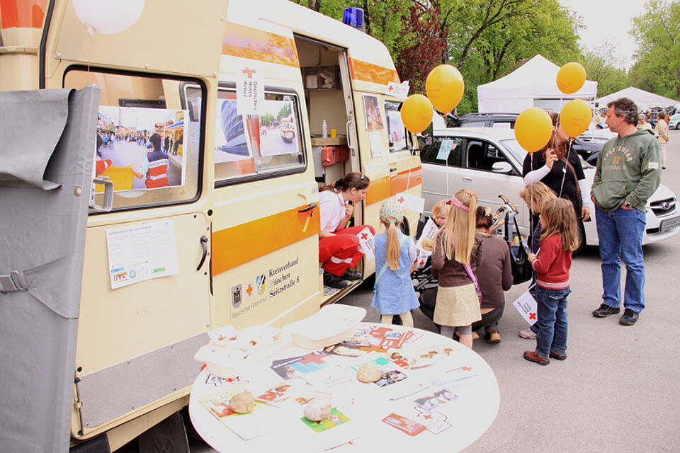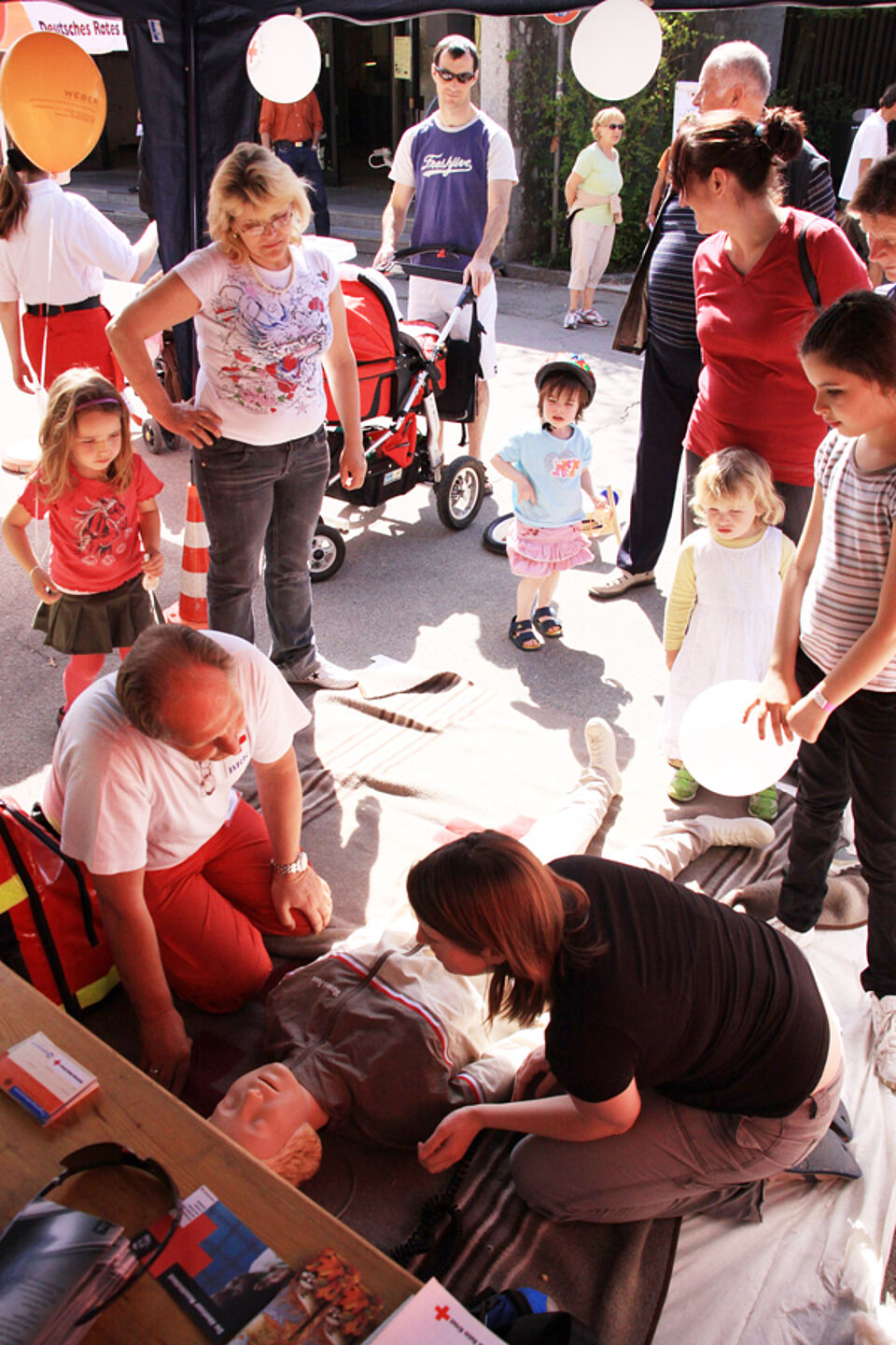 Im Rahmen der Gewerbeschau des Gewerbeverbandes Unterhaching zeigten sich auch die Mitglieder des Unterhachinger Roten Kreuzes von ihrer besten Seite. Neben den Übungen am Stand in Erster Hilfe zeigten sie den Gästen auch grundlegende Verhaltensregeln, etwa beim Auffinden einer potentiell hilflosen Person.