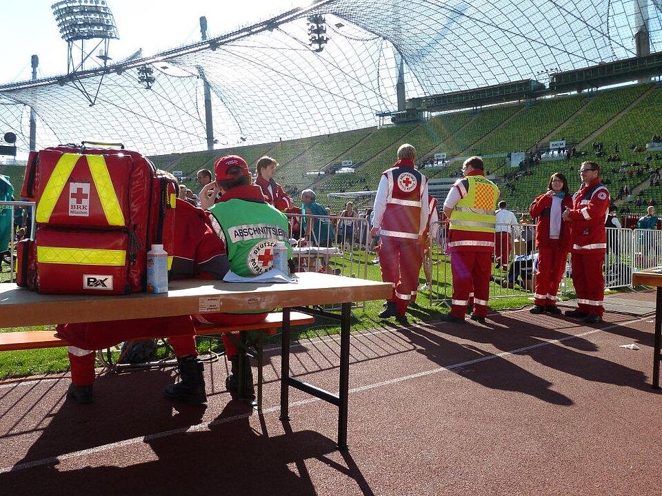 Radl-Sanis mit. Mehrere mobile Notärzte waren zudem jederzeit bereit, um im Ernstfall entlang der Strecke eingreifen zu können. Im Zielbereich am großen Marathontor des Münchner Olympiastadions hatten die Rotkreuz-Helfer mehrere große Zelte aufgebaut, in denen gut 60 Ärzte und Sanitäter die ankommenden Sportler direkt nach dem Zieleinlauf versorgten. Mit dabei waren auch Physiotherapeuten, um akute Krämpfe massieren zu können.