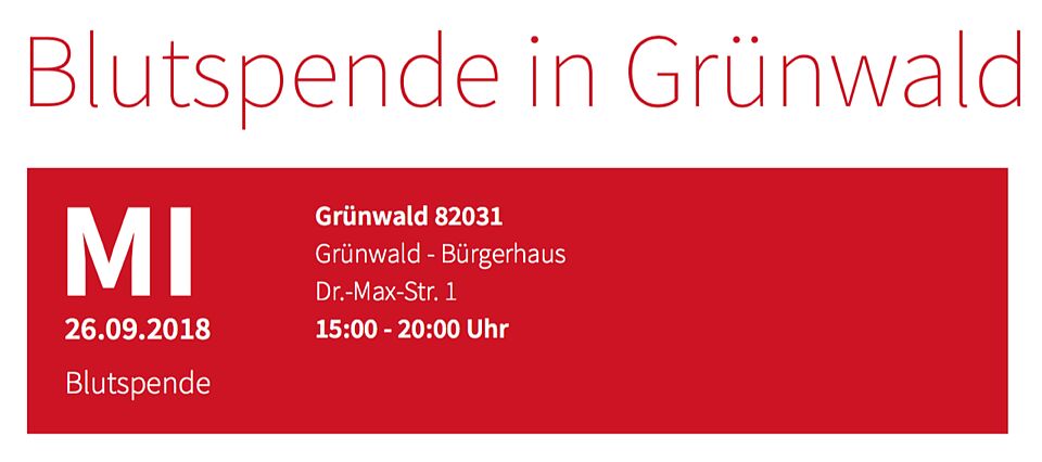 Am kommenden Mittwoch, den 26.09.2018 findet wieder eine Blutspendeaktion in Grünwald statt. Im Zeitraum von 15 bis 20 Uhr stehen wieder die Türen des Bürgerhauses in der Dr.-Max-Straße für Spendewillige offen!
