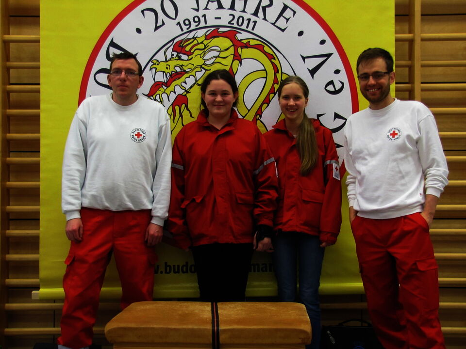 Sanitäter des BRK Ismaning sicherten die medizinische Betreuung der Sportler. Und die waren gleich zu viert gekommen; neben zwei erfahrenen Sanitätern leisteten die beiden Mitglieder der Ismaninger Rot Kreuz Jugend Michaele Huschka und Franziska Petersen eifrig Dienst. Deren Hilfe wurde auch gerne in Anspruch genommen, einige Sportler, die mit kleineren Blessuren aus dem Kampf kamen, suchten die Hilfe der jungen Sanitäterinnen gerne auf. Ernsthafte Verletzungen blieben jedoch aus, lediglich einmal mussten die Sanitäter auf das Feld, nachdem ein Kämpfer kurzzeitig regungslos liegen blieb. Nach kurzer Versorgung konnte er wieder auf die Beine gestellt und entlassen werden.