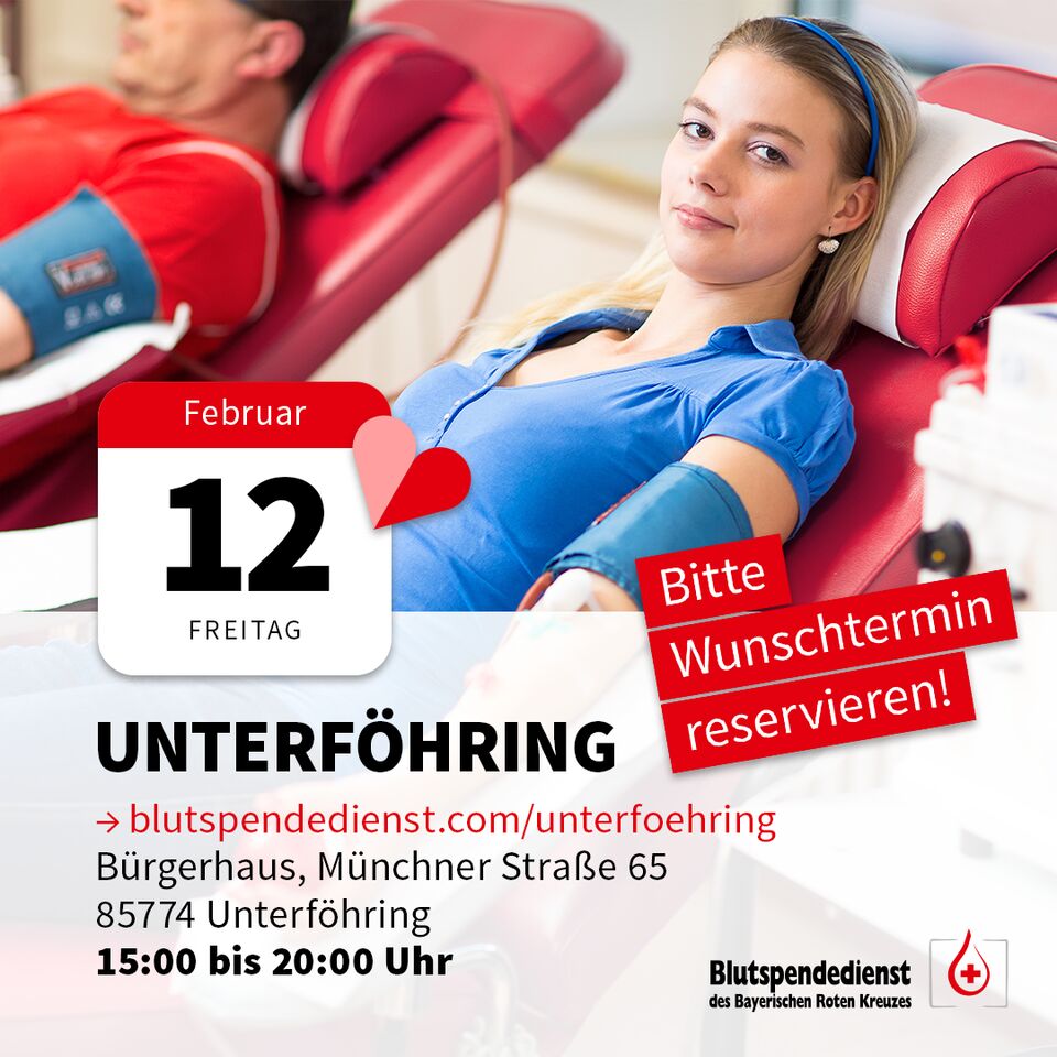 Wer kranken und schwerverletzten Menschen mit einer Blutspende helfen möchte kann am 12. Februar 2021 von 15 bis 20 Uhr nach Unterföhring in den Bürgersaal kommen.