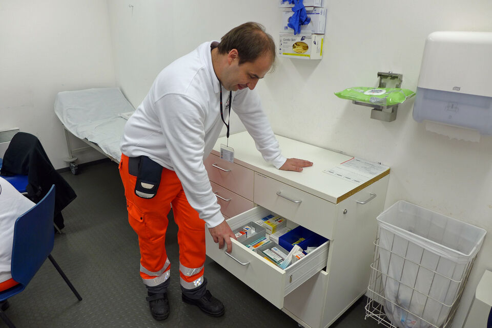 Ganz oben unter dem Stadiondach liegt die Einsatzzentrale des BRK. Fried Saacke erklärt den Ablauf: „Wir stehen hier in Funkkontakt mit allen Rettungsteams und Notärzten im Stadion. Sobald ein Notruf eingeht, schicken wir die nächstgelegene Einheit an den Einsatzort. Da wir per Funk mit der Einheit stets verbunden sind, können wir den Ablauf der Einsätze überwachen und – falls erforderlich – umgehend weitere Rettungsmaßnahmen einleiten.“