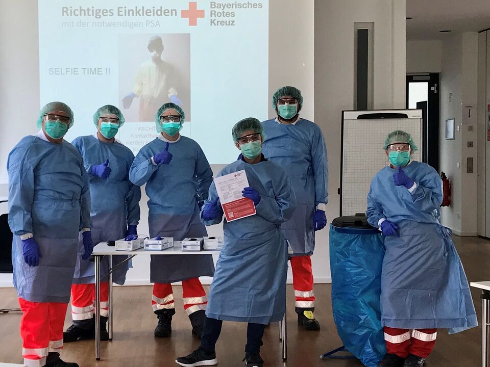 Die BRK Bereitschaft Ismaning hat in Abstimmung mit dem Stab des Kreisverband München alle Einsatzfahrzeuge mit ausreichend Schutzkleidung, Masken, Schutzbrillen und Kittel, bestückt. Des weiteren wurden alle aktiven Einsatzkräfte mittels einer zweieinhalbstündigen Online Schulung und einer praktischen Einweisung durch eine Hygienefachkraft in den erforderlichen Hygienemaßnahmen und dem fachgerechten Umgang mit der Infektionsschutzkleidung gemäß den technischen Regeln für biologische Arbeitsstoffe (TRBA) geschult.