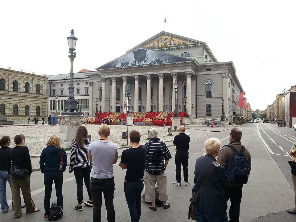 Drei ehrenamtliche Helfer der Bereitschaft Haar des Münchner Roten Kreuzes hatten am Samstag einen ungewöhnlichen Dienst: Ab drei Uhr morgens sorgten sie am Marstallplatz für die Sicherheit von 1700 Nackten. Der amerikanische Künstler Spencer Tunik hatte im Auftrag des Nationaltheaters zu einer großen Aktion mit mehreren Tausend nackten Menschen geladen, um die Inszenierung des "Ring" in den öffentlichen Raum zu bringen.