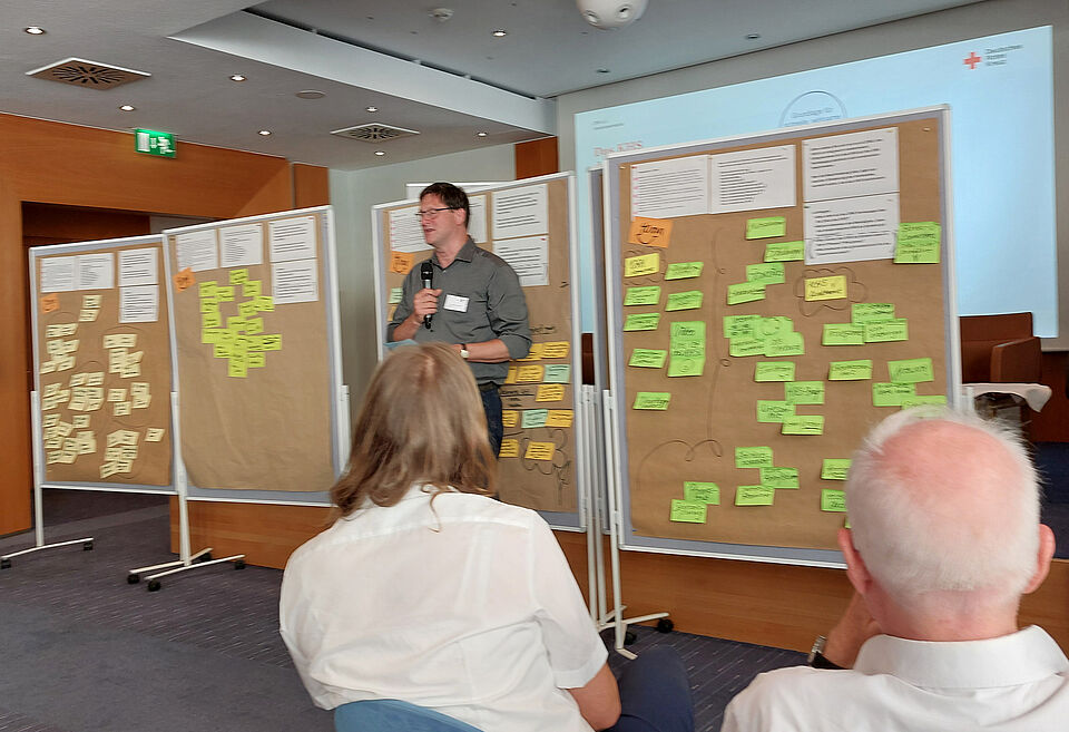 Das Münchner Rote Kreuz stellte einen der rund 100 Teilnehmer*innen aus allen Sparten und Ebenen des Roten Kreuzes. Die Veranstaltung startete am Samstag mit einem Panel zur Veränderung des Bevölkerungsschutzes in Deutschland und wie das Rote Kreuz mit Veränderung umgeht. Im Anschluss diskutierten die Teilnehmer*innen in Kleingruppen anhand von Leitfragen, wie das komplexe Hilfeleistungssystem im Roten Kreuz weiterentwickelt werden kann. Damit ist die Idee gemeint, dass alle Aufgabenfelder und Kompetenzen des Roten Kreuzes in Krisen und Notfällen über Organisationsgrenzen hinweg zusammenarbeiten, um die Bedürfnisse der Hilfsbedürftigen bestmöglich zu bedienen.