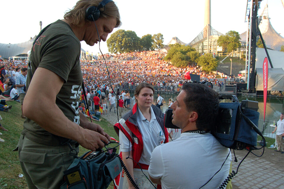 Unter öffentlicher Beobachtung arbeiten die ehrenamtlichen Helfer des Roten Kreuzes häufig. Selten aber sind Fernsehkameras dabei. Ralph Meyer und sein Einsatzteam nahmen am Mittwoch Reporter des Nachrichtensenders n-tv mit zu ihrer Arbeit im Münchner Olympiapark und ließen sich bereitwillig über die Schulter filmen.