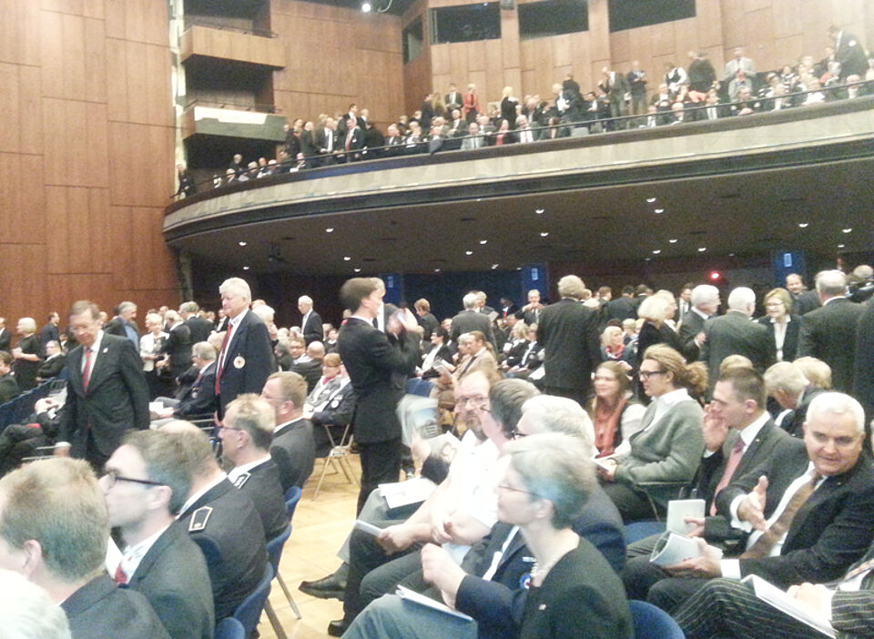 Bei einem zentralen Festakt mit Bundespräsident Joachim Gauck hat das Rote Kreuz in Deutschland heute in der Stuttgarter Liederhalle sein 150-jähriges Jubiläum begangen. Bundespräsident Joachim Gauck würdigte in einer Festrede die Arbeit der Nationalen Hilfsorganisation. DRK-Präsident Dr. Rudolf Seiters hob den Stellenwert der ehrenamtlichen Arbeit für die deutsche Gesellschaft hervor: „In den nächsten Jahrzehnten wird es darauf ankommen, dem demographischen Wandel zu begegnen und die junge Generation für ein bürgerschaftliches Engagement zu gewinnen.“