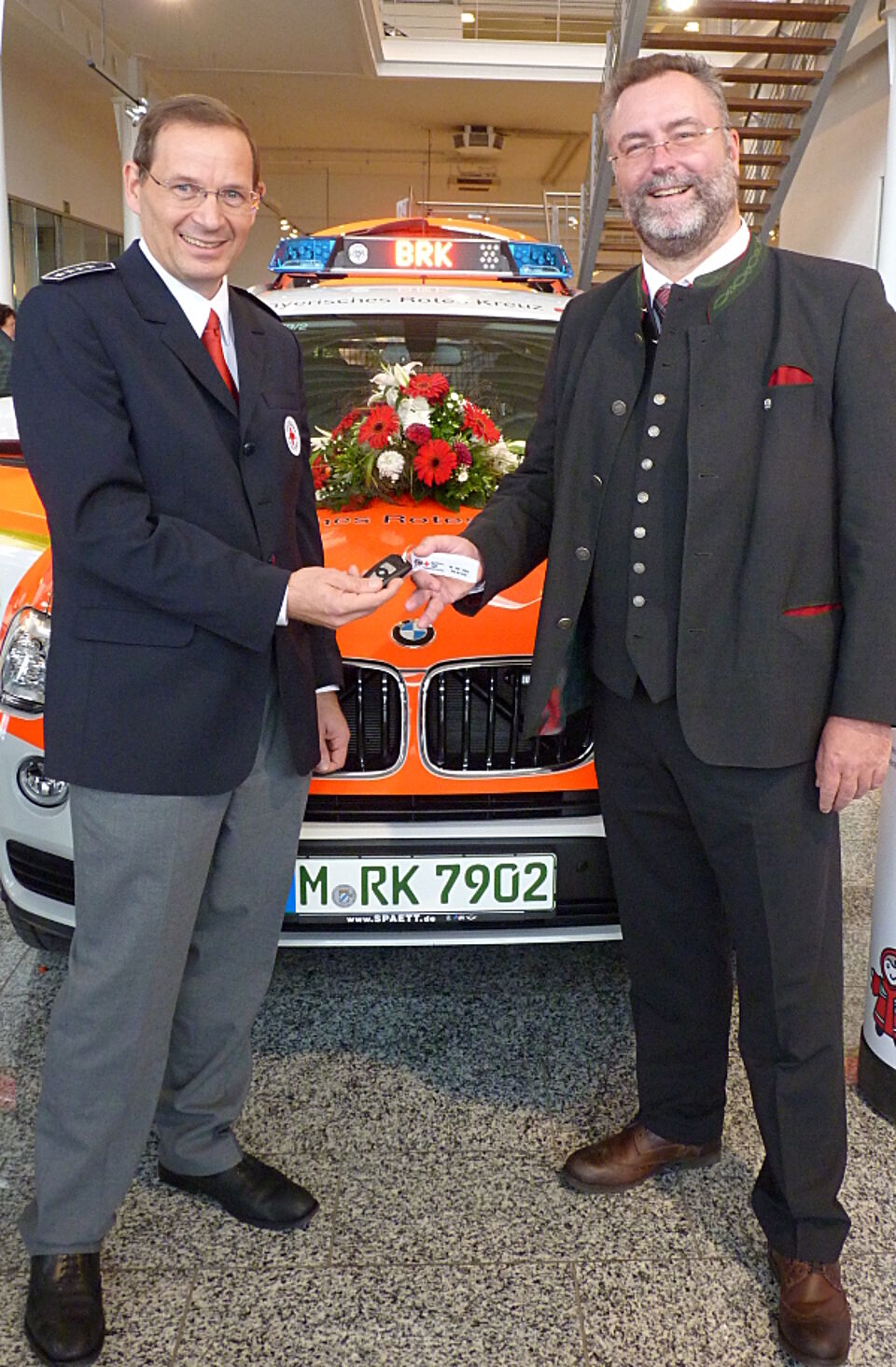 Die Mitglieder der Bereitschaft Ismaning des Münchner Roten Kreuzes freuen sich über das neue Einsatzfahrzeug für den Helfer vor Ort, einen BMW X3. Bürgermeister Dr. Alexander Greulich übergab am Samstag die Schlüssel an Fried Saacke, Leiter der Bereitschaft Ismaning.