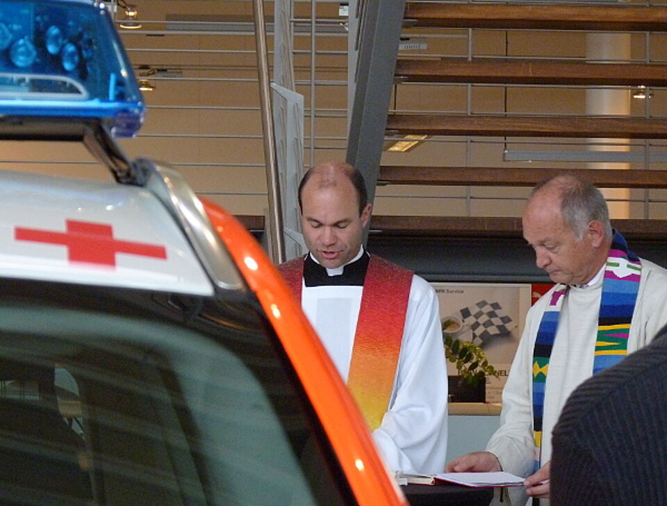 Im Anschluss gaben Pfarrer Dr. Markus Brunner und Diakon Robert Stolz dem Fahrzeug den kirchlichen Segen. Pfarrer Dr. Brunner betonte: „Ein solch beispielhaftes soziales Engagement ist bester Ausdruck von christlicher Nächstenliebe. Ich wünsche den Helfern des Roten Kreuzes Ismaning eine stets unfallfreie Fahrt und bei der Hilfeleistung bestes Gelingen.“ Diakon Stolz schloss sich den Worten an und wünschte auch von seiner Seite eine „stets unfallfreie Fahrt“.