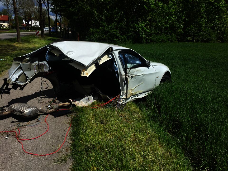 Als die Helfer um kurz nach 13 Uhr die Unfallstelle an der Freisinger Straße erreichten bot sich ihnen ein dramatisches Bild: Der 18-jährige Fahrer eines 3er BMW hatte, vermutlich in Folge überhöhter Geschwindigkeit, die Kontrolle über sein Fahrzeug verloren, kam von der Fahrbahn ab und tuschierte seitlich einen Baum. Durch die Wucht des Aufpralls wurde das komplette Heck samt Hinterachse aus dem Fahrzeug gerissen. Nur mit viel Glück erlitten Fahrer und Beifahrer keine lebensbedrohlichen Verletzungen. Beide wurden von den Sanitätern des BRK Ismaning versorgt und anschließend von zwei Rettungswägen zur weiteren Versorgung in Münchner Krankenhäuser transportiert.