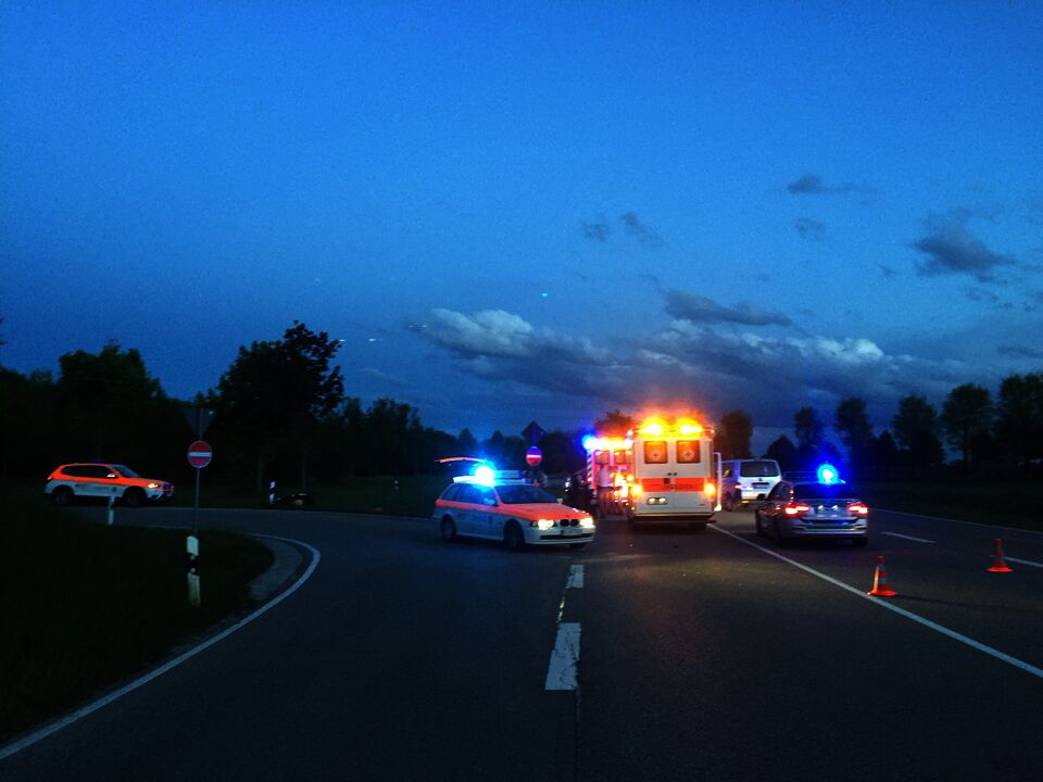 Schon am Abend wurden die Helfer vor Ort erneut von der integrierten Leitstelle alarmiert und rückten mit zwei Einsatzfahrzeugen aus. Auf der Bundesstraße 471 höhe der Aschheimer Straße bei Ismaning war es zu einem schweren Verkehrsunfall gekommen. Eine ebenfalls 18-jährige Fahrerin war auf die Bundesstraße aufgefahren und streifte ein von hinten kommendes Motorrad seitlich. Der Motoradfahrer stürzte, schleifte über die Fahrbahn, landete im gegenüberliegenden Graben und wurde dabei schwer verletzt.