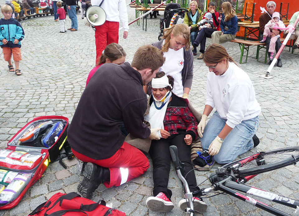 Schließlich zeigten einige Schulsanitäter, wie sie Verletze bei einem Fahrradunfall und bei einer Unterarmverbrennung versorgen, tatkräftig unterstützt von der Mannschaft des First Responders. Gautinger Rotkreuzkollegen waren dazu realistisch als Verletzte geschminkt.
