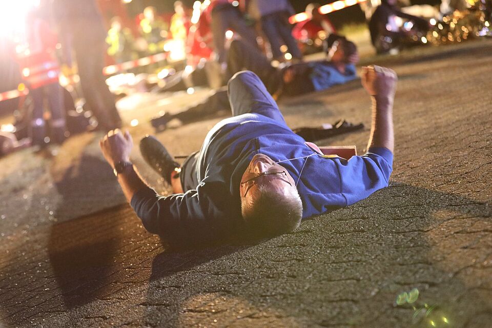 Explosionen, Feuer und 150 geschminkte und schreiende Verletztendarsteller*innen machten die Übungsszenarien erschreckend realistisch. Als Vorlage für die Drehbücher dienten die echten Anschläge von Nizza, Paris, Berlin und München. Die Einsatzkräfte wussten bis zur Alarmierung nicht, was sie erwartet. Die Versorgung von Schusswunden und Verletzungen durch Sprengstoff war für viele in der Praxis neu. Teilweise kamen während der Versorgung der Verletzten weitere Gewaltschauplätze hinzu und die Zahl der „Opfer“ stieg auf bis zu 100 an. „Hier kommt es darauf an, dass unsere Einsatzkräfte die Situation schnell erfassen und systematisch vorgehen.“, erklärt Szenarioplaner Alessandro Genovese vom BRK Kreisverband Oberallgäu.