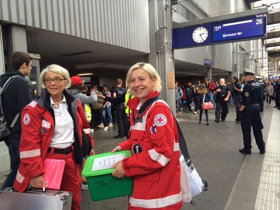 Das Bayerische Rote Kreuz (BRK) ist seit Beginn der Flüchtlingsströme im Einsatz. Flüchtlinge, die aus München weitergeleitet und mit Zügen in andere Städte gebracht werden, erhalten Schutz und Hilfe von Ehrenamtlichen des Roten Kreuzes aus München.