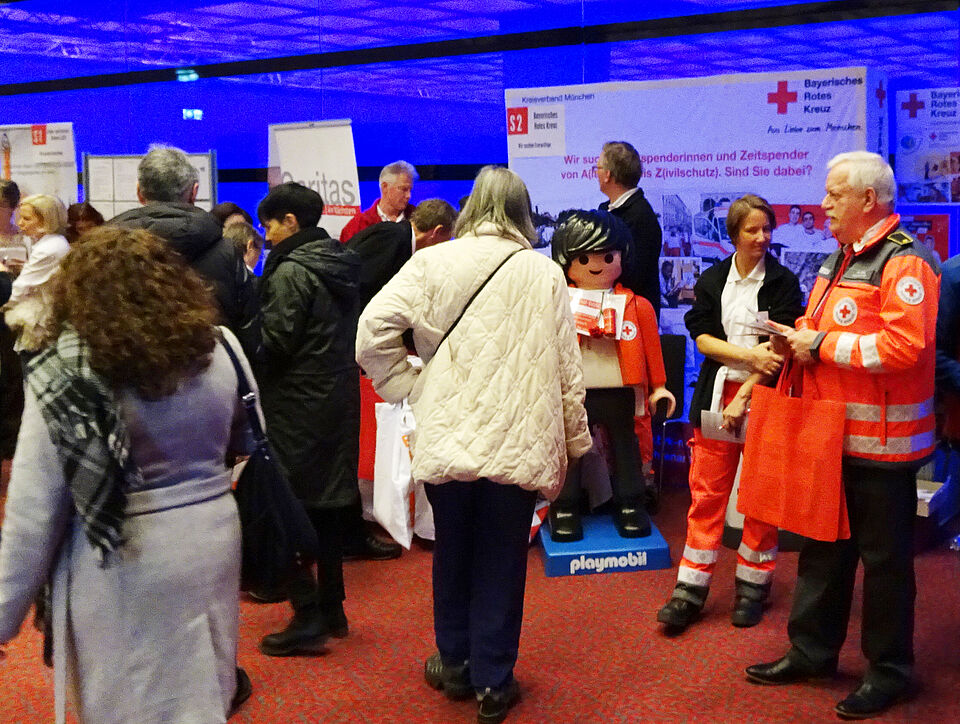 Mitarbeiter*innen der Servicestelle Ehrenamt und ehrenamtlich Aktive aus den Rotkreuzgemeinschaften informierten über die vielfältigen Einsatzmöglichkeiten: Von der Berg- und Wasserrettung über Sanitätsdienst und Katastrophenschutz, Jugendarbeit oder sozialem Engagement für Senior*innen bis hin zur Öffentlichkeitsarbeit und der Mitwirkung in der Kleiderkammer: Für jede*n Engagierten war etwas dabei.