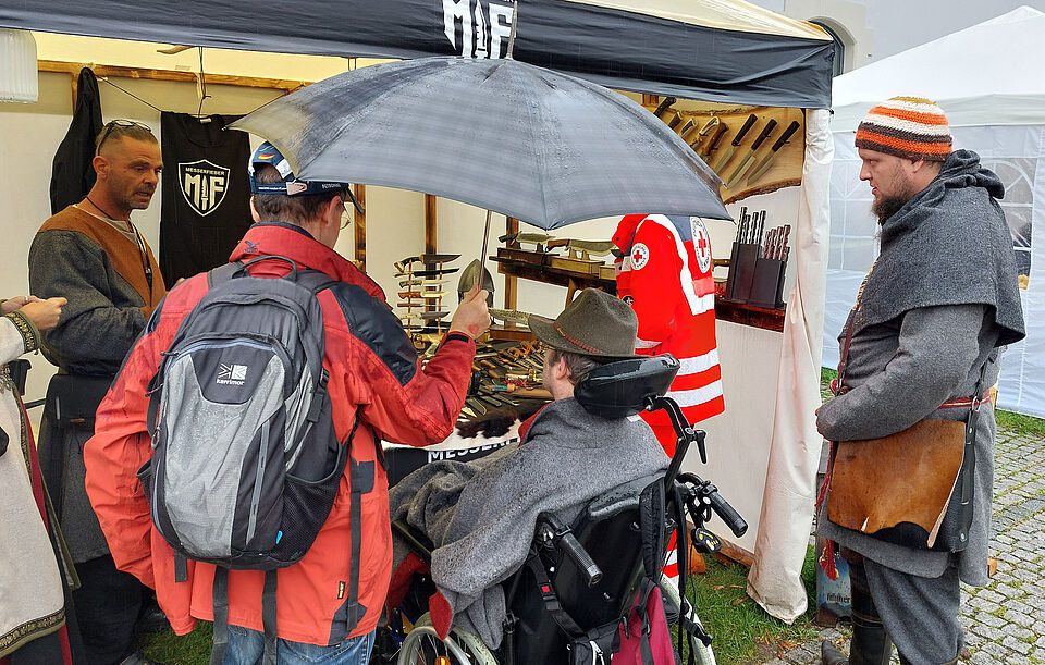 Am vergangenen Sonntag begleitete ein ehrenamtliches Team des Münchner Roten Kreuzes einen Fahrgast zum Mittelaltermarkt Fürstenfeldbruck. Er war früher selbst als Schmied auf ähnlichen Märkten aktiv und konnte daher mit vielen Beteiligten kompetent fachsimpeln. Trotz des Dauerregens war es eine schöne Erfahrung für alle Beteiligten.