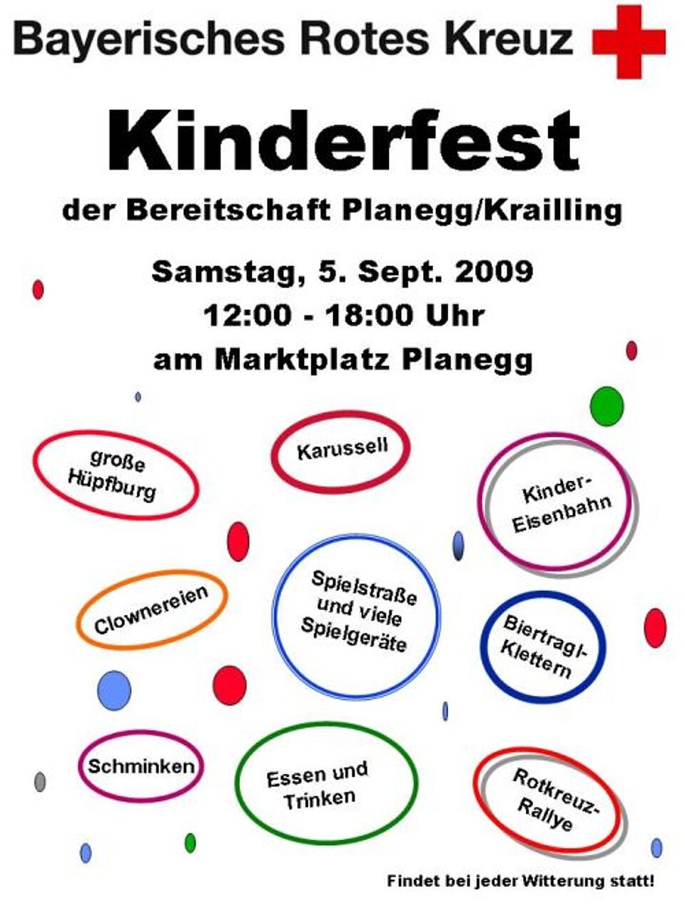 Die Bereitschaft Planegg/Krailling lädt alle Kinder und ihre Eltern zum traditionellen Kinderfest am kommenden Samstag (5. September) von 12 bis 18 Uhr auf den Planegger Marktplatz ein. Geboten wird neben einer Spielstraße mit etlichen Spielgeräten (Stelzen, Eierlaufen, Dosen werfen, Malwand, Tragerlrutsche etc.) eine Kindereisenbahn mit echter Dampflok zum Mitfahren, ein Karusell, eine große Tombola, eine Hüfburg, Biertragerl-Klettern, Schminken, realistische Unfalldarstellung und vieles mehr. Für Essen und Trinken ist natürlich auch gesorgt. Wir freuen uns auf Ihren Besuch!