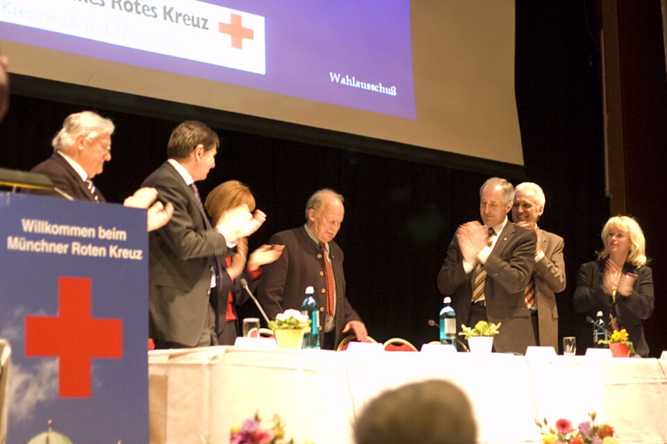 Vor der eigentlichen Wahl bedankte sich Dr. Hans Burghart für die konstruktive Zusammenarbeit in seinen 42 aktiven Jahren beim Münchner Roten Kreuz. Der scheidende Vorsitzende dankte insbesondere den ehrenamtlichen und beruflichen Mitarbeitern, die ihn bei seiner Arbeit unterstützt hatten. Burghart erhielt zum Abschied stehende Ovationen von der Mitgliederversammlung als Dank für sein langjähriges Wirken für das Münchner Rote Kreuz.
