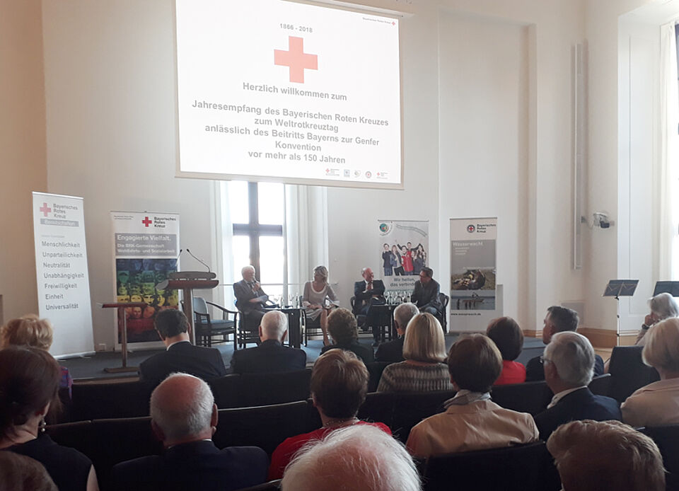 Anlässlich des Weltrotkreuztags am 8. Mai veranstaltete das Bayerische Rote Kreuz (BRK) seinen Jahresempfang in den Räumen des Bayerischen Landtags. Etwa 200 geladene Gäste feierten neben diesem Anlass auch den Beitritt Bayerns zur Genfer Konvention vor 152 Jahren. Daher stand auch das humanitäre Völkerrecht im Vordergrund der Veranstaltung. Das Münchner Rote Kreuz nahm mit drei Vorstandsmitgliedern und zwei weiteren Vertretern an der Veranstaltung teil.