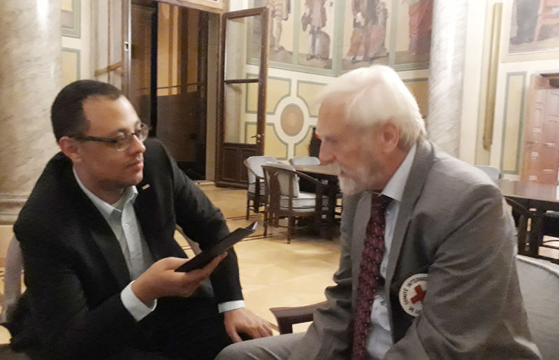 In einer Podiumsdiskussion unter Moderation von Anouschka Horn diskutierten Prof. Jürg Kesselring, Mitglied des Internationalen Komitees vom Roten Kreuz (IKRK), Dr. Johannes Richert, stv. Generalsekretär des Deutschen Roten Kreuzes (DRK) und Prof. Daniel-Erasmus Khan, Völkerrechtler an der Universität der Bundeswehr München über die aktuellen Herausforderungen des Völkerrecht. Das seien nicht nur neue Methoden der Kriegsführung, sondern auch die vielen nichtstaatlichen Akteure, die weltweit an bewaffneten Konflikten teilnehmen und die zum Teil schwer für die Anliegen des humanitären Völkerrechts und den Schutz der Konfliktopfer zu sensibilisieren seien. Johannes Richert betonte dabei, dass es für die Opfer und Betroffenen keinen Unterschied mache, wer Konfliktpartei sei und welche Waffen eingesetzt würden. Das Leiden sei immer gleich groß. Daher lohne sich der Einsatz der internationalen Rotkreuz- und Rothalbmondbewegung für die Einhaltung des Völkerrechts und speziell der Genfer Abkommen heute mehr denn je: "Wir geben nicht auf, wir geben nicht nach", betonte Jürg Kesselring.