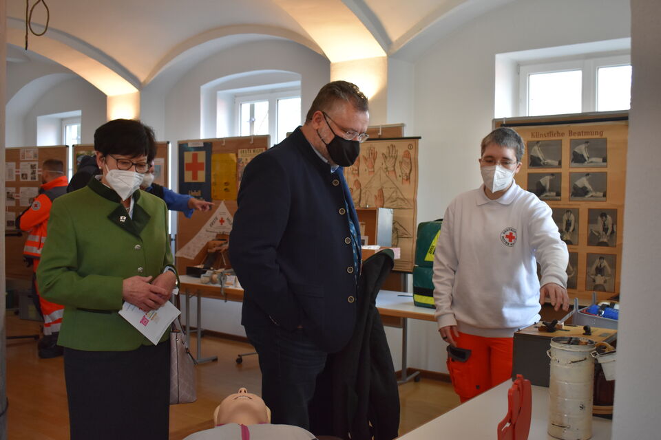 Neben der über hundertfünfzigjährigen Geschichte des Roten Kreuzes und der Erzählung der Entwicklung der örtlichen Rotkreuz Bereitschaft seit deren Gründung vor fünfzig Jahren, ist der Schwerpunkt der Ausbildung der Entwicklung der Ersten Hilfe und des Sanitätsdienstes gewidmet. Gezeigt werden einige sehr alte Exponate etwa zur Beatmung oder Herz-Lungen Wiederbelebung, aber auch moderne Geräte, die noch im Einsatz sind. Weitere Themen sind in diesem Zusammenhang die Entwicklung des Patiententransportes und der Kommunikationstechnik für die organisierte Erste Hilfe bei Sanitätsdiensten oder als Helfer vor Ort.