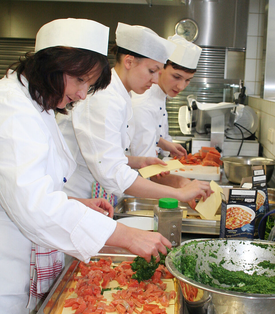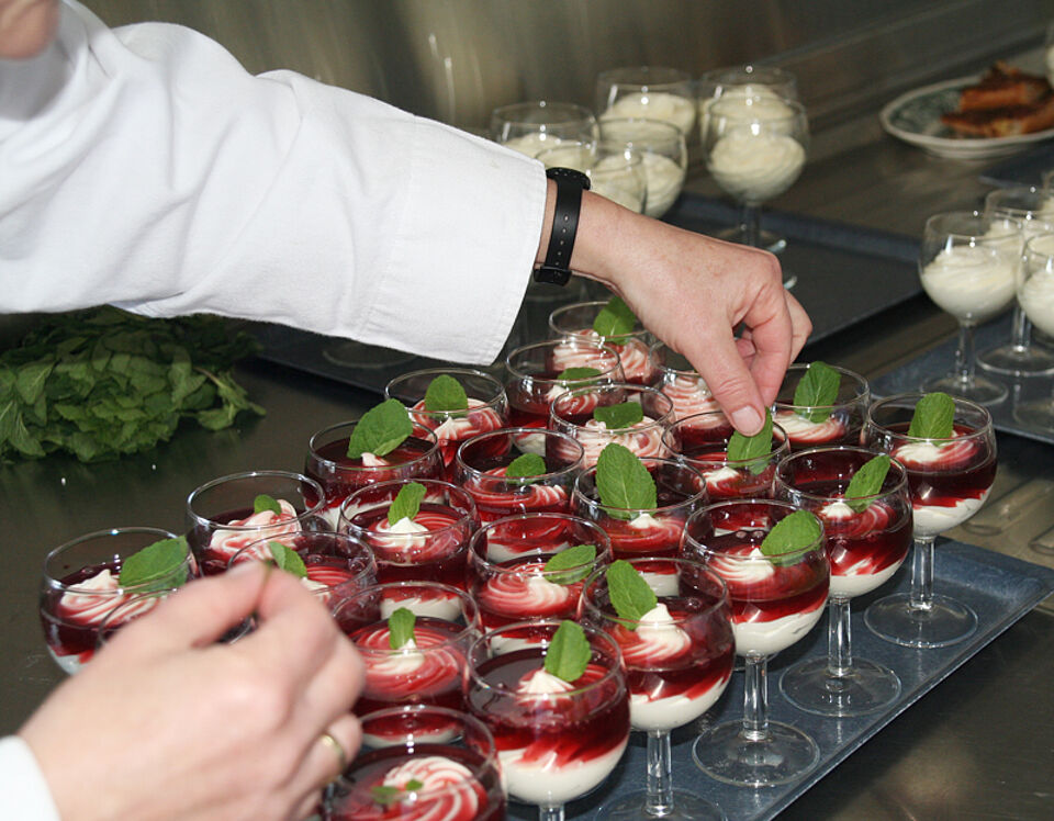 Sieben ehrenamtliche Helfer der Bereitschaft Deisenhofen standen den ganzen Tag in der Großküche in der Geschäftsstelle und bereiteten nicht nur Wurst-, Speck-, Käse- und Fischplatten als Vorspeisen vor. Als Appetizer gab es zudem Spinatstrudel und Quiche, Blattsalate mit geröstetem Speck rundeten das Buffet ab. Als Hauptgang hatten die Festgäste die Wahl zwischen Lachslasagne und Schweinefilet, zum Nachtisch gab es mousse au chocolat und Bayerisch Creme.