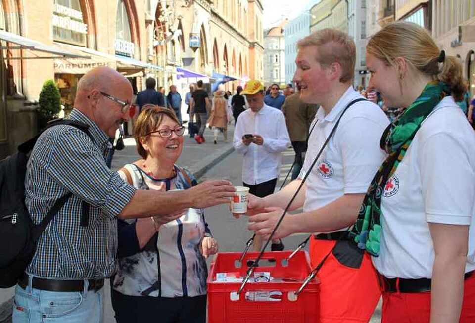 Bei strahlendem Sonnenschein schwärmten am Samstag, den 07. Mai 2016 mehrere ehrenamtliche Rot-Kreuz-Helfer*innen mit Kaffee in der Fußgängerzone aus.