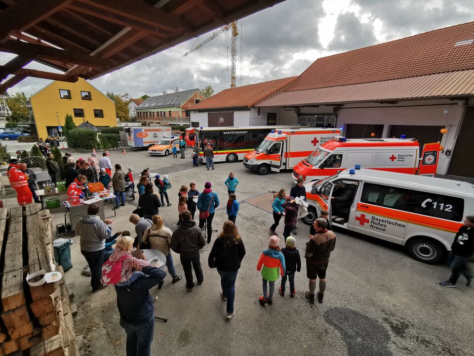 Auf dem Gelände der Fahrzeughallen des BRK konnten die Kinder Einsatzfahrzeuge vom Dienstwagen des Helfer vor Ort über Mannschaftstransportwagen bis zum Rettungswagen anschauen. Besonders Highlight war die Mobile Sanitätsstation, für die die Bereitschaft einen Neoplan Linienbus um und ausgebaut hat.