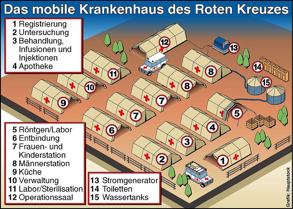Das moderne Zeltkrankenhaus verfügt über zwei Operationssäale für die Bereiche Chirurgie, Innere Medizin, Gynäkologie, sowie die Funktionsbereiche Röntgen, Labor und eine Apotheke. Damit stellt es eine grundlegende und lebensnotwendige kurative, präventive, und kommunale Gesundheitsversorgung im Krisengebiet sicher.