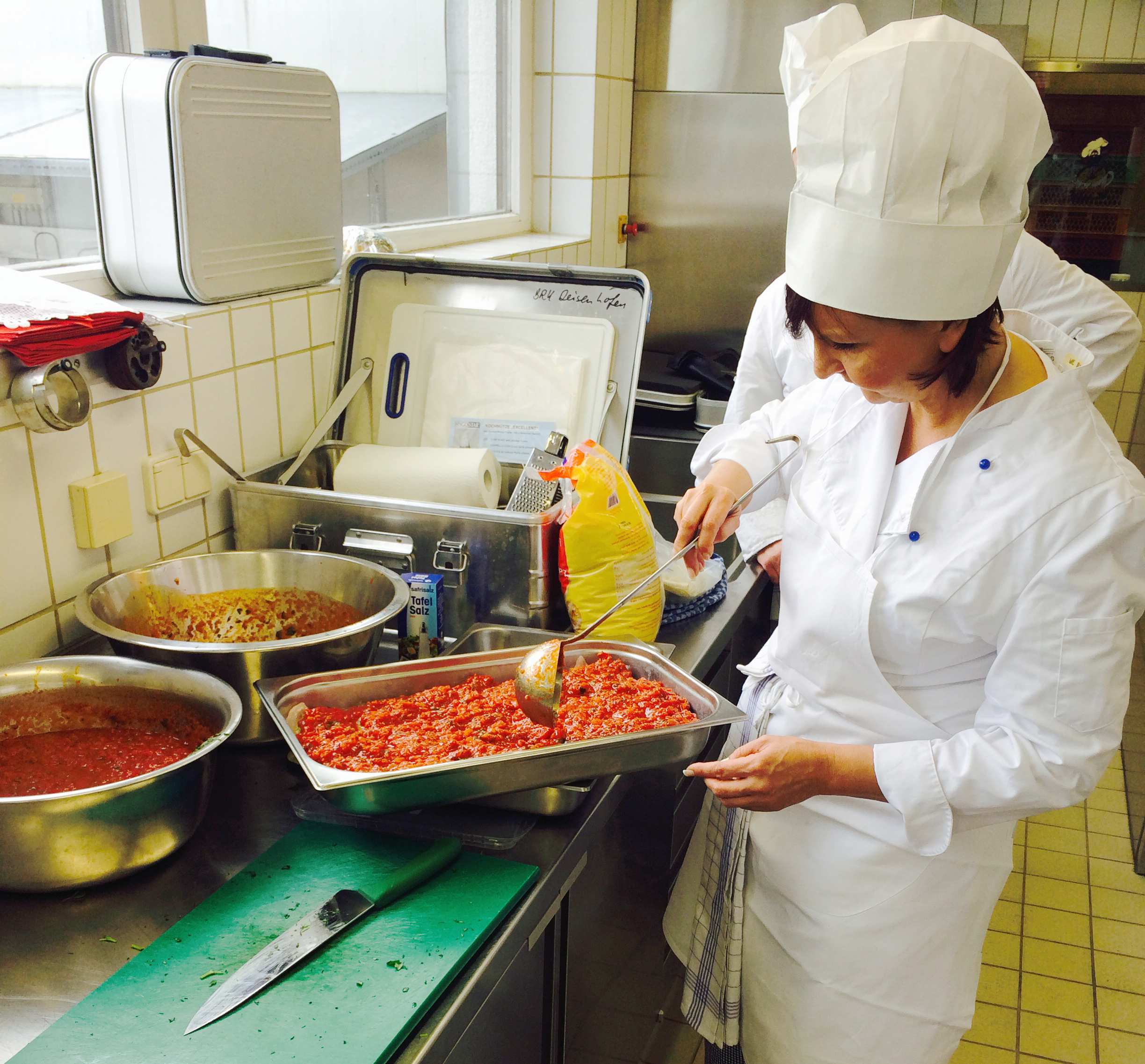 Verpflegungsdienst des Münchner Roten Kreuzes für das leibliche Wohl der Rotkreuzkollegen. Bereits am Donnerstag kauften die ehrenamtlichen Helfer ein, am Freitag bauten sie die Ausgabestelle in Johanneskirchen aus. Der Samstag begann dann um fünf Uhr morgens mit dem Abholen der Brezenstangen beim Bäcker. Während Helfer der Bereitschaft Süd 2 in Johanneskirchen das Frühstück ausgaben, kochten die Helfer der Bereitschaft Deisenhofen schon das Mittagessen: Putenschnitzel in Tomatensauce mit Reis oder alternativ Mediterraner Gemüsereis und eine Bayerisch Crème mit Himbeersauce. Nachmittags gab es dann noch Kuchen.