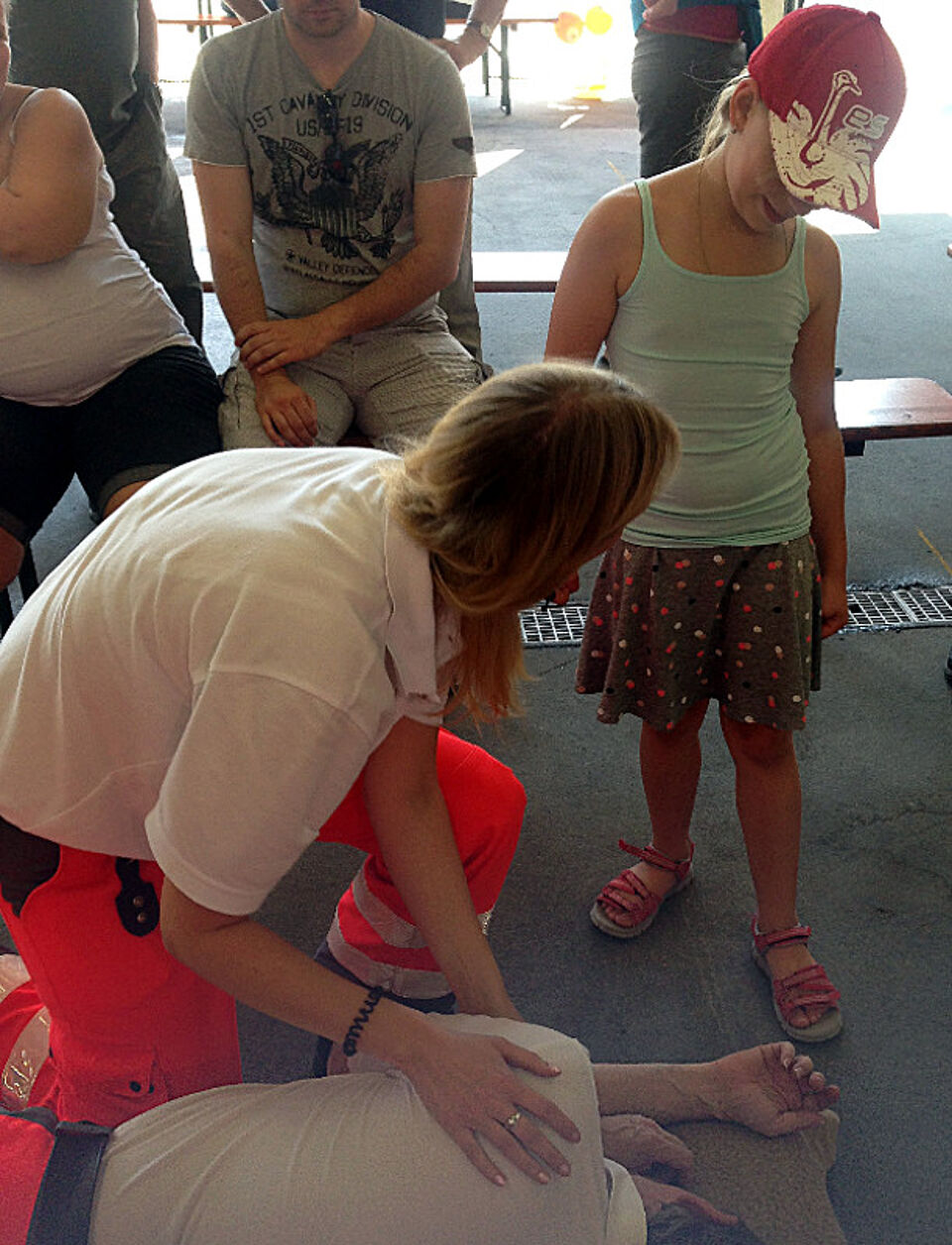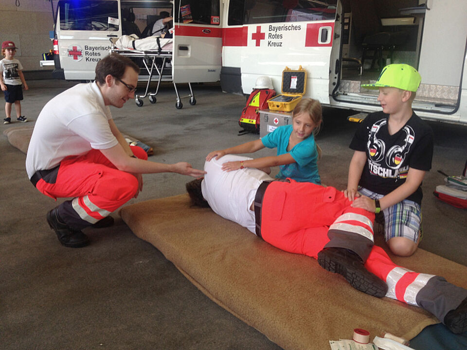 Währenddessen fand im Schatten der Garagenplätze ein Erste-Hilfe-Parcours statt, der von vielen Familien mit kleinen Kindern besucht wurde. Wer sich traute, durfte die stabile Seitenlage mit Unterstützung der Bereitschaftsjugenden aus Ismaning und Zentral 1 üben. Eine Matte weiter konnten sich die Besucher das Anlegen eines Druckverbandes von West1 und der Jugend aus Höhenkirchen-Siegertsbrunn vorführen lassen oder ausprobieren.