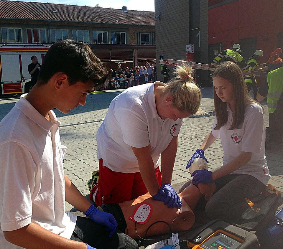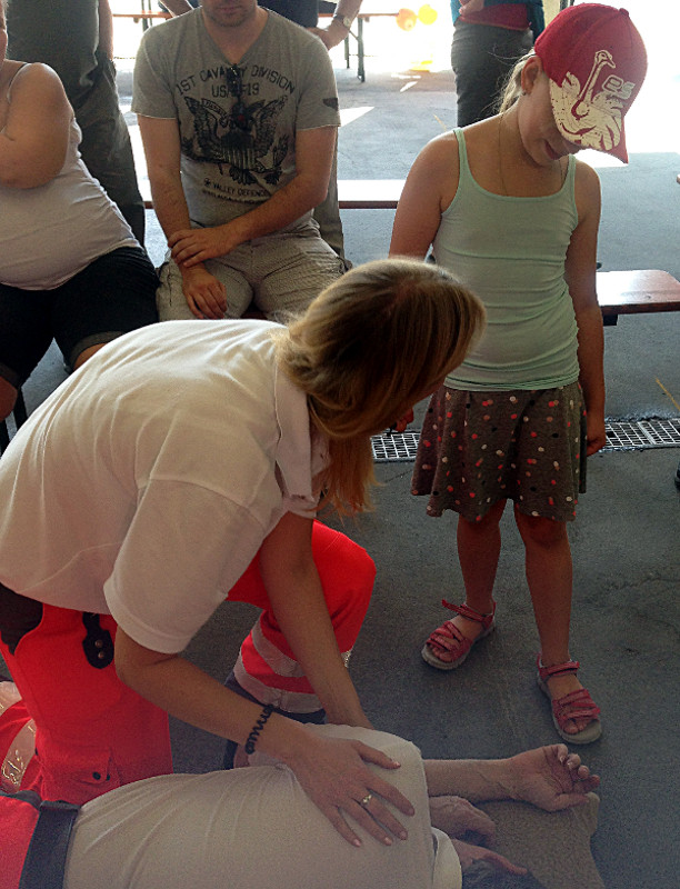 Schließlich war die Rettungskette ab Unfall über die Wiederbelebung bis zum Transport in den Rettungswagen zu besichtigen. Die Kollegen der Bereitschaften Zentral1 und Nord1 zeigten hierzu die notwendigen Schritte.