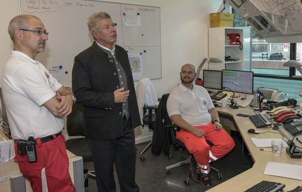 Münchens Oberbürgermeister Dieter Reiter besuchte am Freitag, den 25.9.2015, die Wiesn-Sanitätsstation des Münchner Roten Kreuzes im Servicezentrum Theresienwiese. Reiter zeigte sich beeindruckt vom hohen organisatorischen und medizinischen Niveau der Station und war voll des Lobes für das außerordentliche Engagement der ehrenamtlichen Einsatzkräfte und der Ärzte des BRK-Kreisverbandes München: 'Gut, dass es das Münchner Rote Kreuz auf der Wiesn gibt. Es ist einfach enorm, welcher Arbeitseinsatz hier zum größten Teil ehrenamtlich geleistet wird. Wenn mal was passiert, stehen hochqualifizierte Einsatzkräfte und Ärzte bereit, um verletzte oder erkrankte Wiesnbesucher und -mitarbeiter medizinisch zu versorgen.'