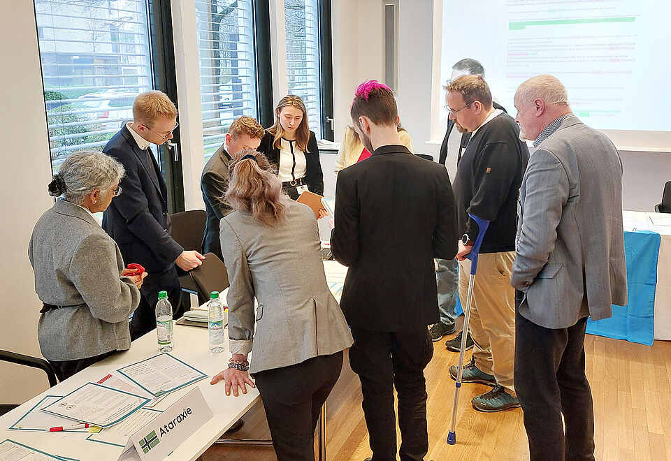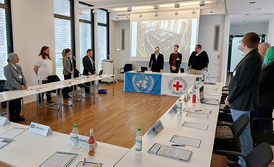 Nach dem gemeinsamen Mittagessen wechselten die Teilnehmer*innen dann in förmliche Kleidung und lasen sich in ihre Rollen als Staatenvertreter*innen der Konferenz ein. In der eigentlichen Simulation verhandelten sie dann auf Basis ihrer Länderinteressen den vorgelegten Konventionsentwurf. Dafür suchten sie Verbündete, hielten Reden, argumentierten für alternative Formulierungen und stimmten über die verschiedenen Vorschläge ab. Im Ergebnis konnten sich die fiktiven Staaten nach zähen Verhandlungen knapp auf eine fünfte Genfer Konvention einigen.