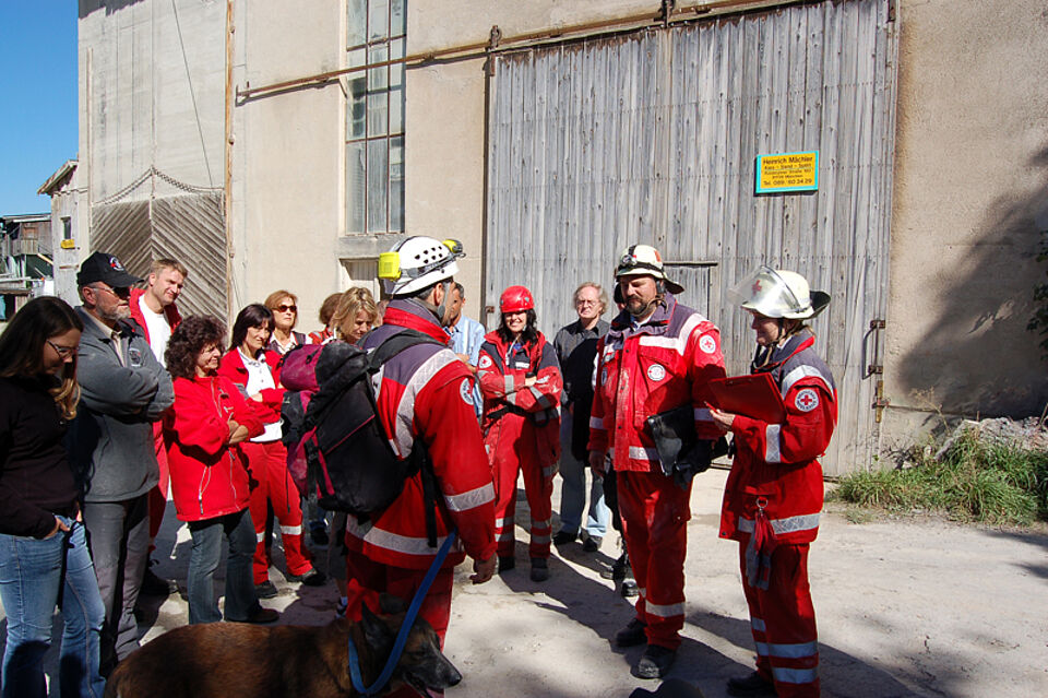 “Morgens um Sieben ging es in Deisenhofen mit der theoretischen Prüfung los, dann wurde die Fähigkeit der Hunde getestet, sich ihrem Hundeführer unterzuordnen”, erklärt Anja Alt von der Rettungshundestaffel, “anschließend ging es für die Prüflinge in das Kieswerk Mächler in München zur Trümmerprüfung oder in ein Waldgebiet bei Straßlach zur Flächenprüfung. Insgesamt vier Mal in zwei Tagen haben wir diesen Prüfungsablauf für mehr als 30 Rettungsteams durchgeführt.” Während der Hundeführer die theoretische Prüfung alleine bestehen muss, ist der Rest des Tages Teamarbeit. Sowohl bei der Unterordnungsprüfung, als auch bei den unterschiedlichen Sucharten wird die Teamleistung bewertet. Ob im Kieswerk, wo ein eingestürztes Haus simuliert wird, oder im Wald, wo nach einer vermissten Person gesucht werden soll, muss jeder Hund innerhalb von dreißig Minuten drei versteckte Personen finden und darf sich dabei nicht von Kleidungsstücken oder Wurstsemmeln irritieren lassen. Die Prüfung ist mehr als ein Routinetest: Nur etwa die Hälfte aller Teams besteht sie, die Anforderungen sind sehr hoch. “Nicht jedes Team besteht, schließlich geht es im Ernstfall um Menschenleben, da muss man den Teams uneingeschränkt vertrauen können,” sagt Frank Singer, stellvertretender Fachdienstleiter der Münchner Rettungshundestaffel und selbst Prüfer im Bayerischen Roten Kreuz.