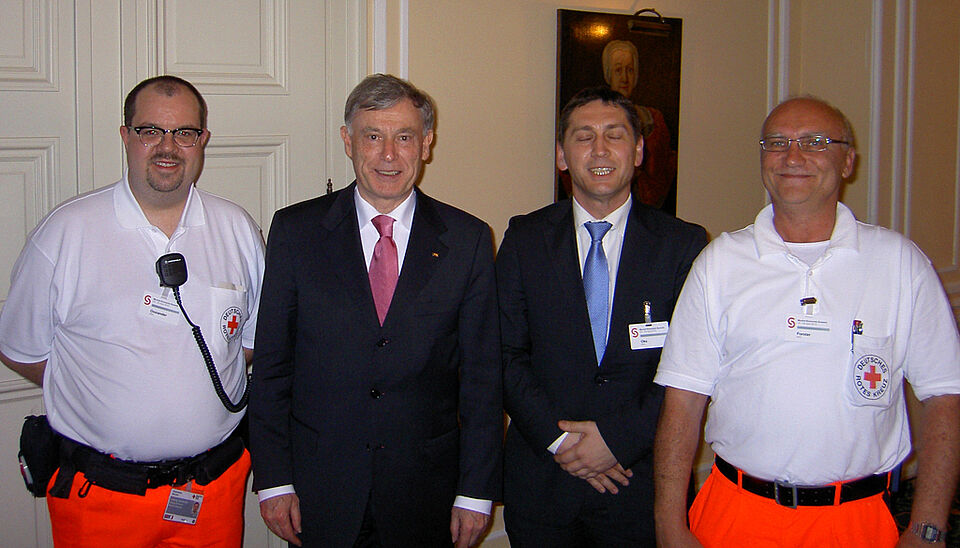 Beim Besuch von Bundespräsident Horst Köhler beim "Munich Economic Summit" in München sorgten am 29. April ehrenamtliche Mitarbeiter des Münchner Roten Kreuzes für die Sicherheit des deutschen Staatsoberhauptes. Ludwig Ossiander und Franz Forster von den Bereitschaften des Münchner Kreisverbandes und Rotkreuz-Notarzt Eduard Oks standen mit einem Rettungswagen für den Notfall bereit.