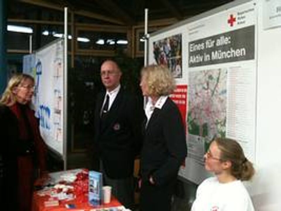 Zusammen mit der stellvertretenden Geschäftsführerin des Münchner Roten Kreuzes und einem Helfer der Wasserwacht, präsentierten gestern zwei ehrenamtliche Helfer der Bereitschaft Haar die vielfältigen Aufgaben und möglichen Tätigkeitsfelder für eine ehrenamtliche Beschäftigung beim Roten Kreuz auf der Ehrenamtsmesse in Kirchheim bei München.