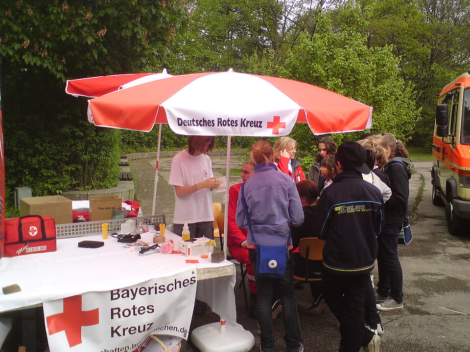 Die Rotkreuzler stellten sich den Fragen neugieriger Schüler, zeigten und erklärten die Ausstattung des Rettungswagen und informierten über Erste-Hilfe und andere Angebote des Münchner Roten Kreuzes.