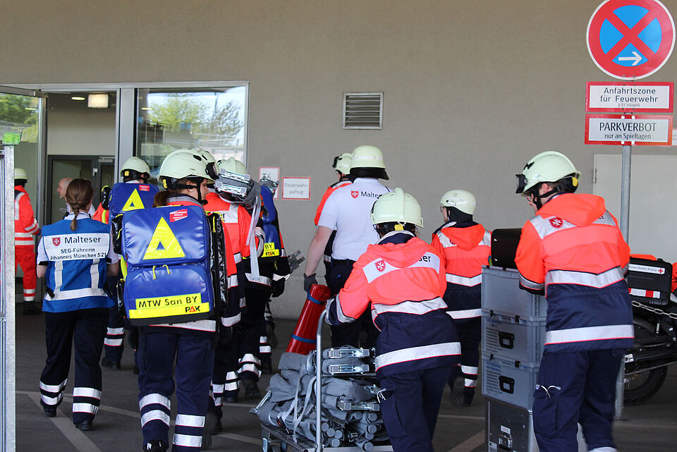 Mit den nach und nach eintreffenden weiteren Einsatzkräften werden die Patienten im Verlauf der Übung weiter versorgt. Auch den Abtransport der vielen verletzten Patienten von einem Übergabepunkt in der Arena simulieren die Helfer, als Krankenhaus dient das Rotkreuzhaus in Oberschleißheim. Die Schnelleinsatzgruppen Betreuung und Psychosoziale Notfallversorgung kümmern sich parallel um die unverletzten Betroffenen, die ihre Erlebnisse verarbeiten müssen.