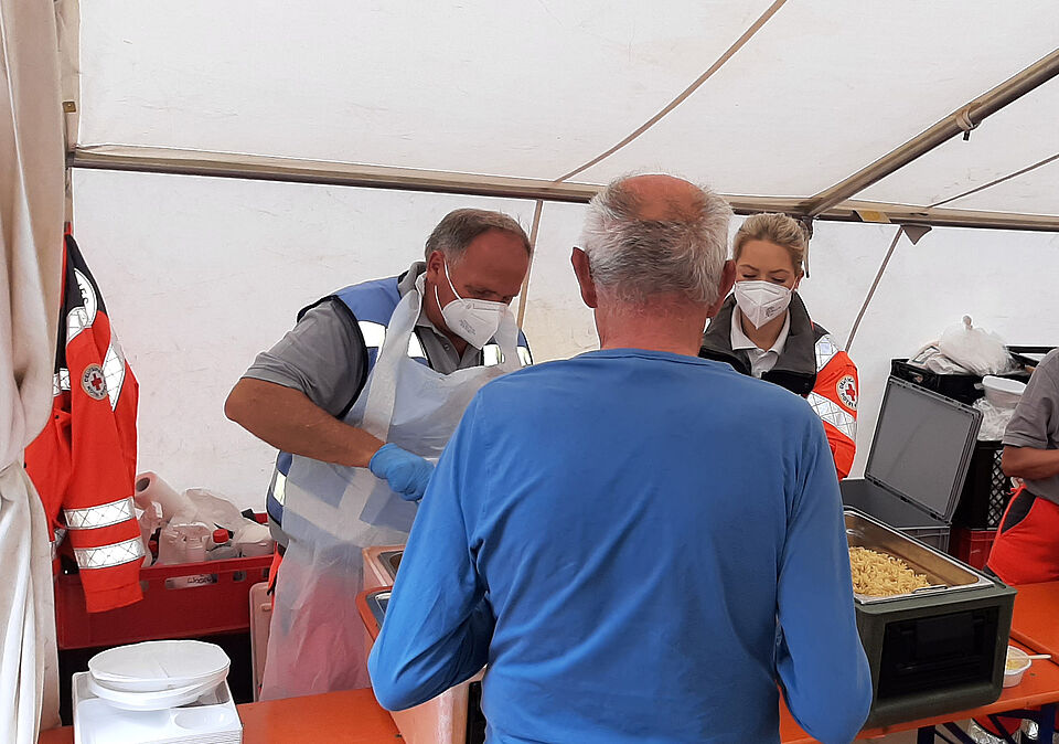 Am Sonntag Abend erfolgte dann eine Teilübergabe an ehrenamtliche Kollegen aus Niederbayern. Die eigentliche Essenszubereitung erfolgte jedoch ab Montag in einer eigens eingerichteten mobilen Großküche des Roten Kreuzes im nahegelegenen Grafschaft, wo in den nächsten Wochen täglich Verpflegung für bis zu 10.000 Menschen gekocht und verteilt wird. Am Montag ging es dann zurück nach München, wo die Helfer*innen gegen 18 Uhr eintrafen. Dort stellten sie die Einsatzbereitschaft wieder her und füllten verbrauchtes und defektes Material auf.