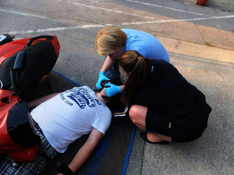 Das BRK hat daher nach der Anfrage der Chef-Schulweghelferin auch sofort zugesagt den Kurs ehrenamtlich und unentgeltlich zu halten. Gemeinsam mit Rettungsassistent Thomas Büchner und dem Fachpfleger für Intensiv und Anästhesie Thomas Angenendt hat Bereitschaftsleiter Saacke den Kurs durchgeführt. Damit die Teilnehmer später auch möglichst viel von dem Kurs behalten und anwenden können wurde sehr viel Wert auf praktische Übungen gelegt. An insgesamt sechs verschiedenen Stationen wurde der Lernstoff vermittelt und alle Teilnehmer konnten so den ganzen Tag intensiv üben.