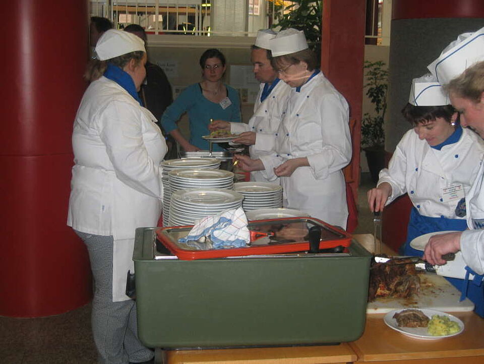 250 Portionen Schweinebraten an Kartoffel- und Selleriesalat mit pikanter Bratensoße und Semmel bereiteten die Helfer zu und gaben sie anschließend aus. Glück für die Teilnehmer: da weniger Personen kamen als geplant, fielen die Portionen entsprechend größer aus.