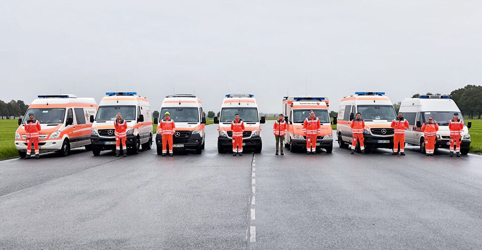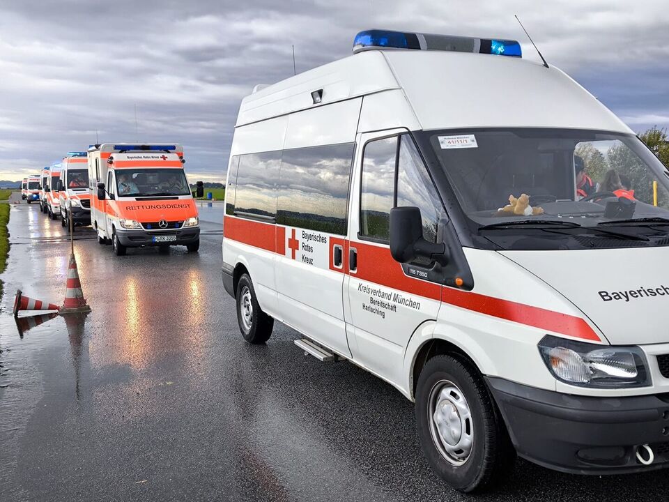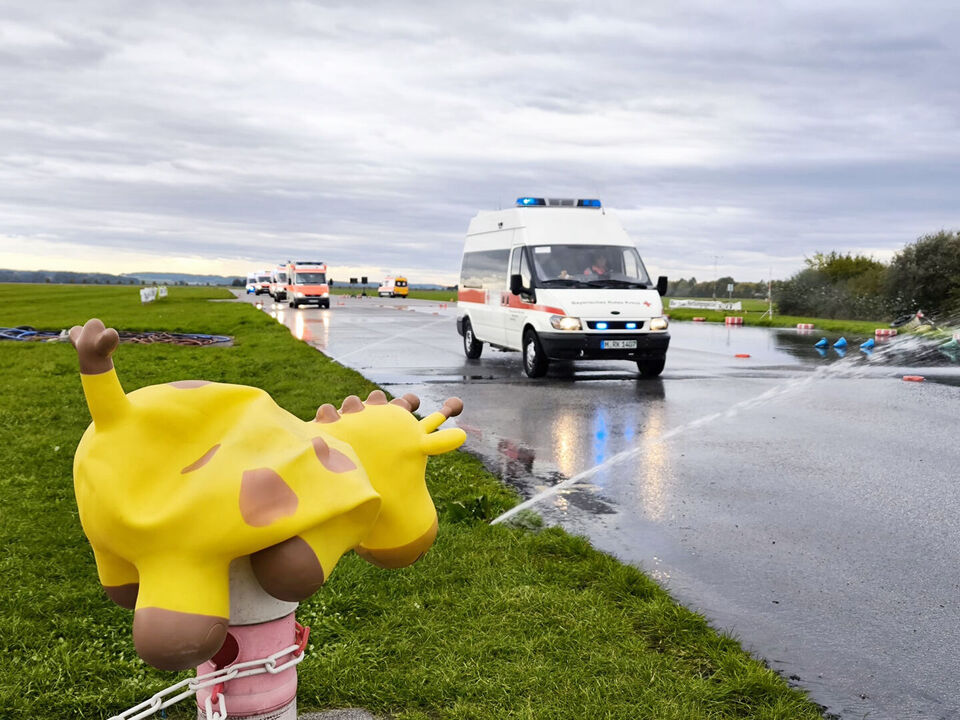 Deshalb finden auf dem Fahrübungsplatz der Gäubodenkaserne in Feldkirchen bei Straubing regelmäßig Fahrtrainings für Fahrer*innen von Einsatzfahrzeugen statt. Am Samstag war es wieder so weit und zehn ehrenamtliche Rotkreuzler*innen der Bereitschaften des Münchner Roten Kreuzes fuhren mit sieben Fahrzeugen zum Training.