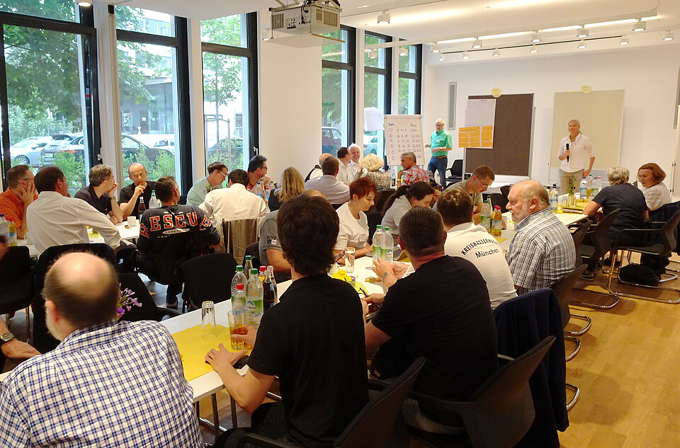 Nach einem Impulsvortrag zu den Auswirkungen des gesellschaftlichen Wandels auf das ehrenamtliche Engagement im Münchner Roten Kreuz tauschten sich die Teilnehmer*innen zunächst über die aktuellen und zukünftigen Ideen und Strategien zur Mitgliedergewinnung aus. Nachmittags ging es dann konkret um den Blick in die Zukunft und die Frage, wie sich die ehrenamtlichen Aufgabenfelder verändern werden. Ihre Ergebnisse präsentierten die Kleingruppen im Plenum.
