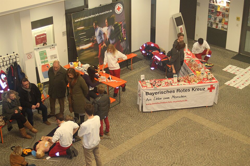 Am Sonntagmittag trafen sich dann Helfer von Bereitschaft und Jugendrotkreuz zum Standaufbau. Auf den Nachmittag verteilt hatten wir einigen Zulauf an unserem Informationsstand. Neben guten Gesprächen und einem Gesundheitscheck mit Blutdruck und –zuckermessung kam heuer erstmals der von der Gemeinde Grünwald gespendete Übungsdefibrillator zum Einsatz. Nachdem die Gemeinde vor kurzem vier neue SOS-Stationen mit Defibrillatoren aufgestellt hat, war hier das Interesse der Bürger besonders groß. An unserer Reanimationsstation konnten Interessierte den ganzen Nachmittag die Grundlagen der Wiederbelebung üben, sich über den richtigen Ablauf von Reanimationsmaßnahmen informieren und den Einsatz der sogenannten AEDs trainieren. Diese sind auch in vielen U-Bahn-Stationen oder anderen öffentlichen Einrichtungen vorhanden. Im Verlauf zeigten einige Besucher reges Interesse an unserem Reanimationstraining „Der Schock fürs Leben“. Das etwa zweistündige Training ist genau auf das Auffrischen der Wiederbelebung und Stabiler Seitenlage ausgelegt. Weitere Interessenten können nähere Informationen unter